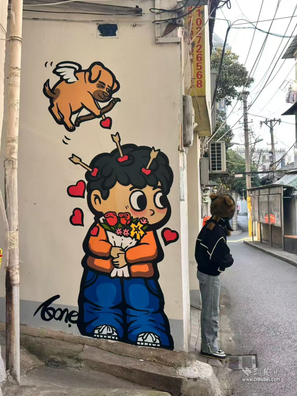 走出彭劉楊路地鐵B2口,來到社區(qū)八卦井旁,一面粉墻惹人注目,櫻花飛揚、四只貓咪相依蹲坐。在社區(qū)攜手武漢學院藝術(shù)與傳媒學院青年志愿者開展的“墻上生花,美在西廠”主題活動中,10余名青年志愿者用畫筆和創(chuàng)意,打造出這面繪有櫻花和貓咪的“武漢”主題墻。