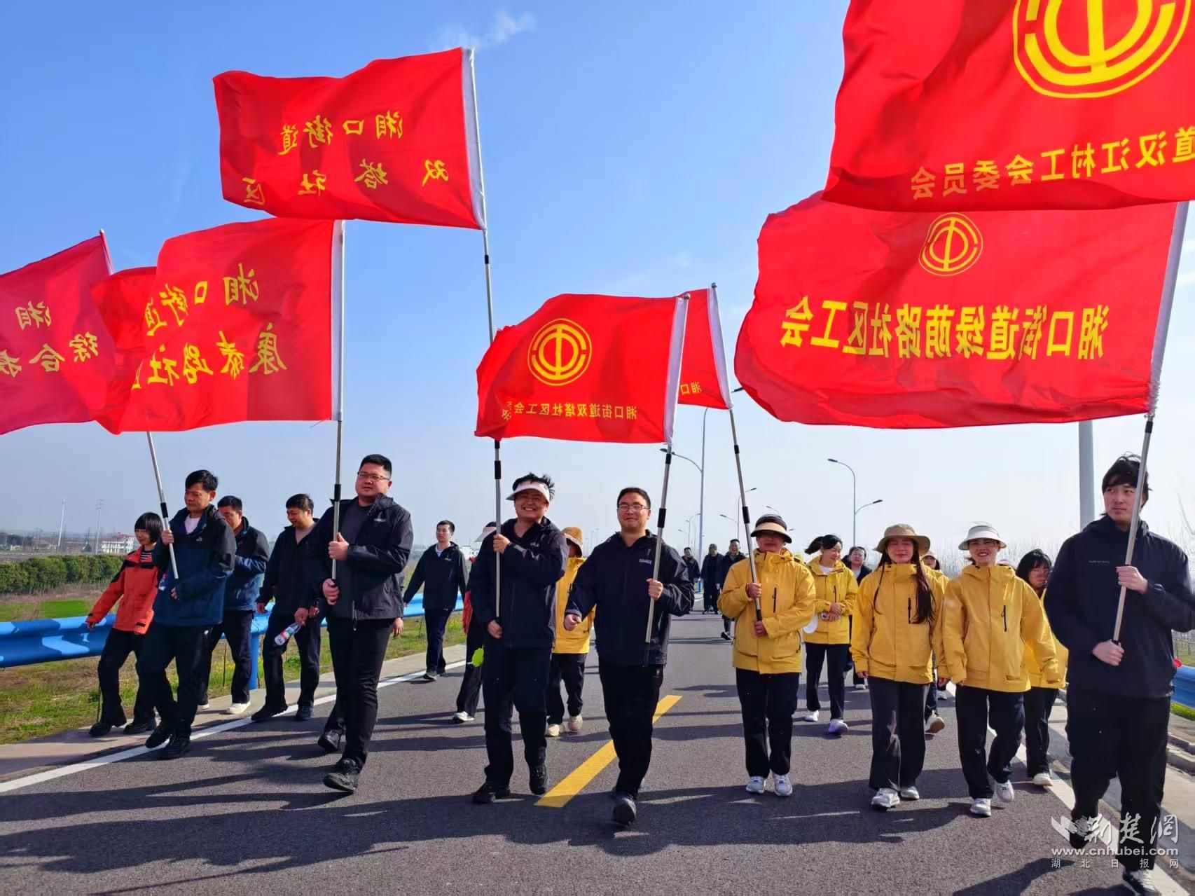 上午9時(shí)整,一聲清脆的鳴槍劃破晴空,健步走活動(dòng)正式拉開(kāi)序幕!全體職工精神抖擻、意氣風(fēng)發(fā),身著統(tǒng)一的運(yùn)動(dòng)裝,從喜鵲湖有序上堤,向著大垸子閘奮勇前行。腳下,是蜿蜒整潔、風(fēng)景如畫的喜鵲湖最美鄉(xiāng)村公路;身旁,是柳綠花紅、生機(jī)盎然的田園盛景;耳畔,是同事間的歡聲笑語(yǔ)與春日的鳥鳴啾啾。大家或并肩漫步、暢談心聲,或闊步前行、舒展筋骨,將工作的疲憊與壓力,盡數(shù)消散在這春風(fēng)拂面的愜意之中,沉浸式感受漢水之南的靈秀與壯闊。