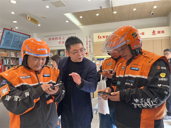 社保工作人員為騎手介紹靈活就業(yè)的個人養(yǎng)老保險政策。 通訊員供圖