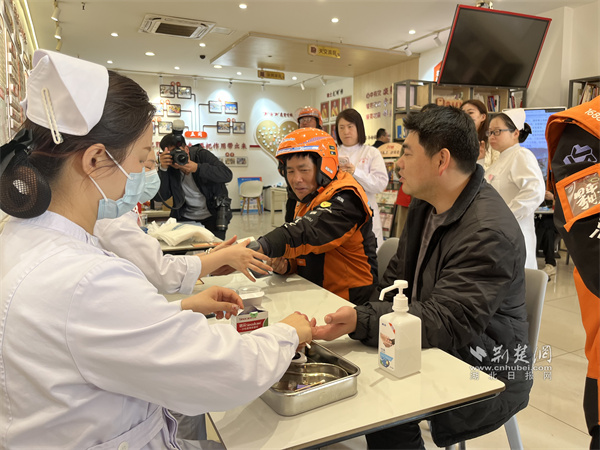 活動特別設(shè)置自由提問與便民服務(wù)環(huán)節(jié),將服務(wù)窗口“零距離”前移。社保處工作人員一對一解讀新就業(yè)形態(tài)人員個人養(yǎng)老保險政策;漢口銀行工作人員同步普及個人公積金政策,并開通社保卡“即時辦”綠色通道,騎手們可在咨詢間隙現(xiàn)場辦結(jié),切實踐行“數(shù)據(jù)多跑路,群眾少跑腿”的服務(wù)理念。同時,武漢市第三醫(yī)院醫(yī)療隊將義診服務(wù)送進驛站,為到場騎手逐一測量血壓、檢測血糖,結(jié)合戶外作業(yè)特點送上針對性健康指導(dǎo)。