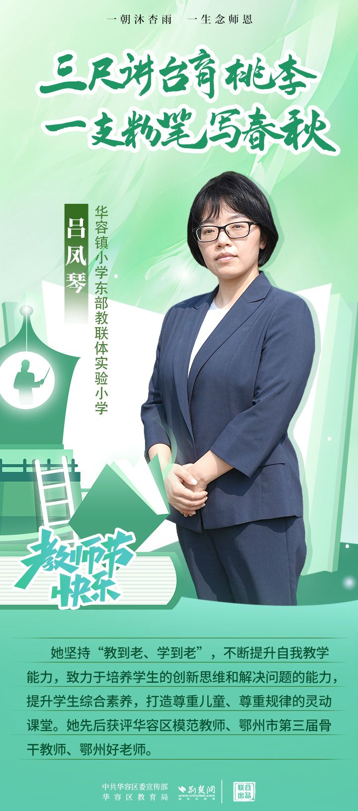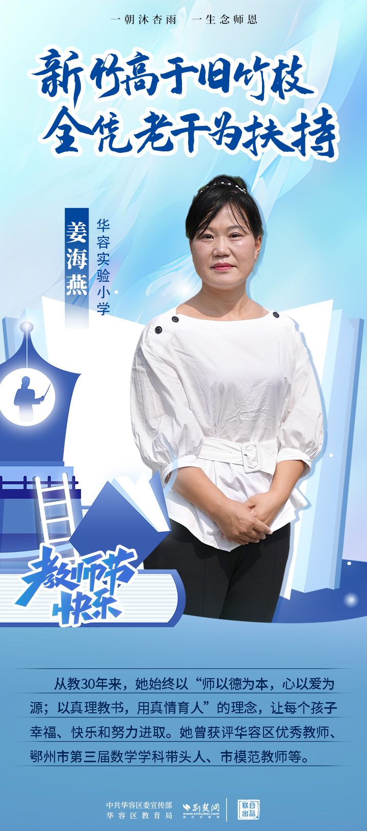 荊楚網(wǎng)(湖北日報網(wǎng))訊(記者 劉璐 通訊員 張曉琴)百年大計,教育為本;教育大計,教師為本。在教師節(jié)來臨之際,中共華容區(qū)委宣傳部聯(lián)合荊楚網(wǎng)(湖北日報網(wǎng))推出創(chuàng)意海報,姜海燕、廖進等6名老師入選“荊楚好老師”群星計劃。她們?彰顯了新時代教師的風采,?為教育事業(yè)的發(fā)展貢獻了重要力量?,向了不起的她們致敬!