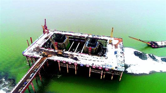 1月1日,建設(shè)者在赤壁長江大橋上忙碌著。連日來,中鐵大橋局五公司項目部廣大建設(shè)者放棄元旦節(jié)日休息,不分晝夜,不畏嚴(yán)寒,加緊 施 工 ,于2018年 12月31日完成南岸灘橋首個水中墩承臺施工。目前南岸灘橋11個水中墩承臺,已經(jīng)開工9個,各作業(yè)點全面開花。(視界網(wǎng)馬永斌 攝)