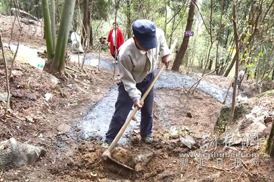 在山上的一片陡坡上,記者看到,二十多名村民正在熱火朝天地鋪路,山上不時(shí)還有來來往往爬山的村民,原來,今天是該村周家灣達(dá)觀山生態(tài)休閑公園試開放的第一天。