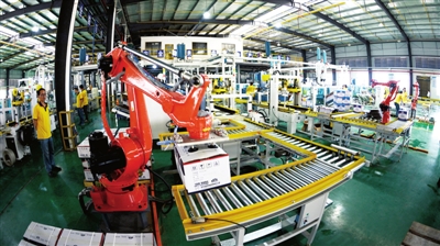 4月29日,通城縣通成高新材料有限公司運用自動機械手臂進行生產(chǎn)。