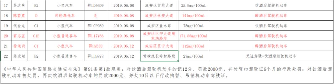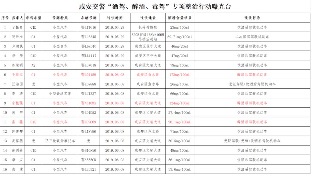 咸安公安分局交警大隊對酒駕醉駕持續(xù)保持高壓嚴管“零容忍”態(tài)勢,同時對近半個月(5月29日——6月13日)以來的酒駕醉駕駕駛人進行實名曝光。