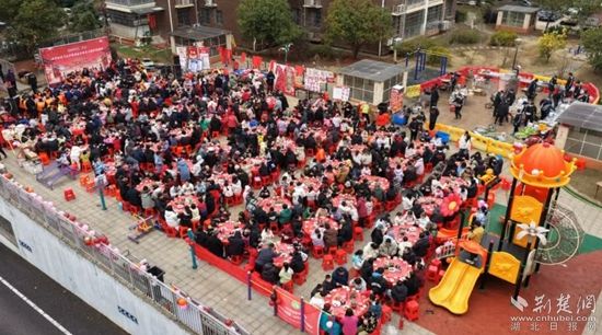 2月7日,臘月二十,咸安區(qū)浮山街道香城社區(qū)書苑小區(qū)廣場(chǎng)上,60張圓桌依次排開(kāi),700多位居民攜家?guī)Э诟斑@場(chǎng)鄰里之約,啤酒燒鴨的濃香、合菜面的爽口在空氣中交織,舞獅鑼鼓與歡聲笑語(yǔ)相映成趣。這場(chǎng)“我們的節(jié)日·春節(jié)”社區(qū)百家宴,正是咸寧社區(qū)文化節(jié)的生動(dòng)縮影。
