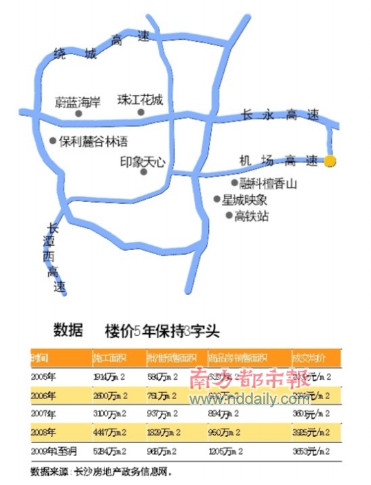 如 果 說 廣 州 是 個“ 大 工地”,長沙可以說是一個正在開發(fā)中的“超級大盤”。打開一張本地發(fā)布的《長沙樓市圖》,發(fā)現(xiàn)地圖上密密麻麻都布滿了樓盤,在這個占地1.18萬平方千米的大地盤分成了10多個大型的地產(chǎn)板塊,每個板塊都有數(shù)十個樓盤在售。