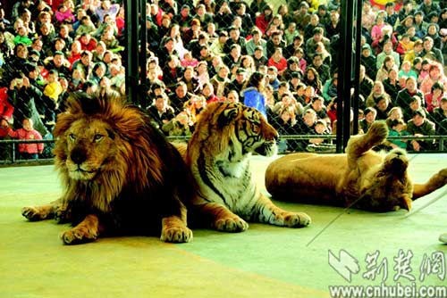 圖為:虎年最受追捧的當(dāng)屬武漢動(dòng)物園的“小虎隊(duì)”,表演場次較平時(shí)增加一倍。 記者劉茜通訊員何志華攝